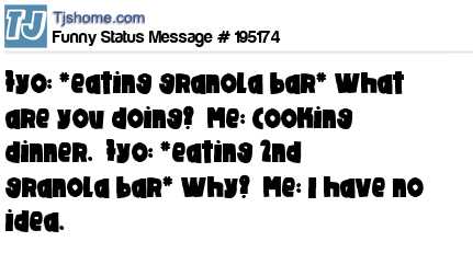 X says 7yo: *eating granola bar* What are you doing?  Me: Cooking dinner.  7yo: *eating 2nd granola bar* Why?  Me: I have no idea.