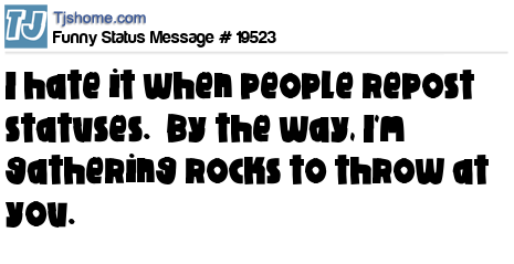 X I hate it when people repost statuses. By the way, I'm gathering rocks to throw at you.