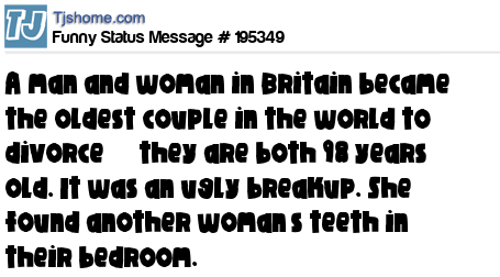- # 207339 A man and woman in Idaho became the oldest couple in the world to divorce — they are both 98 years old. It was an ugly breakup too...... She found another woman’s teeth in their bedroom.