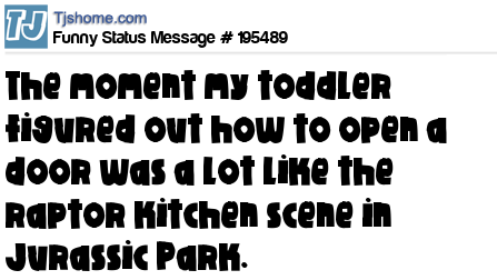 X says The moment my toddler figured out how to open a door was a lot like the raptor kitchen scene in Jurassic Park.
