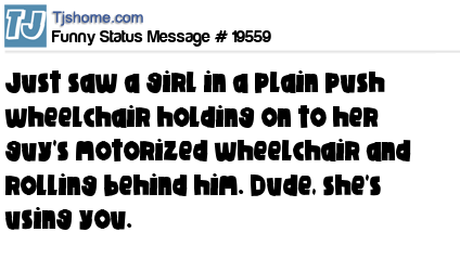 - # 26428 Just saw a girl in a regular wheelchair holding onto her boyfriend's motorized wheelchair. Dude, she's totally using you!!