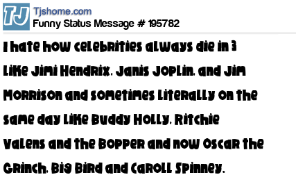 X is I hate how celebrities always die in 3 like Jimi Hendrix, Janis Joplin, and Jim Morrison and sometimes literally on the same day like Buddy Holly, Ritchie Valens and the Bopper and now Oscar the Grinch, Big Bird and Caroll Spinney.