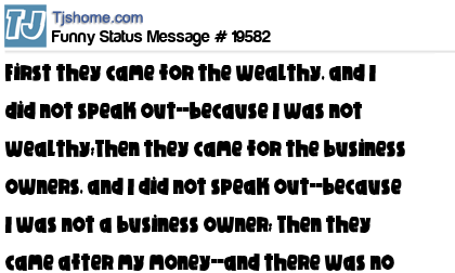 X First they came for the wealthy, and I did not speak out--because I was not wealthy;Then they came for the business owners, and I did not speak out--because I was not a business owner; Then they came after my money--and there was no one left to speak for