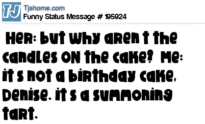 X says Her: but why aren’t the candles ON the cake? Me: it’s not a birthday cake, Denise. it’s a summoning tart.