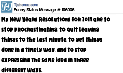 X says My New Years Resolutions for 2019 are to stop procrastinating, to quit leaving things to the last minute, to get things done in a timely way, and to stop expressing the same idea in three different ways.