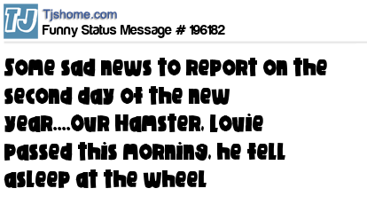 X says Some sad news to report on the second day of the new year....Our Hamster, Louie passed this morning, he fell asleep at the wheel