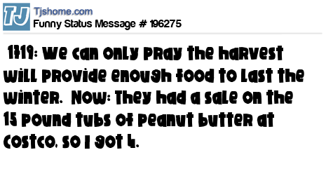 X says 1719: We can only pray the harvest will provide enough food to last the winter. Now: They had a sale on the 15 pound tubs of peanut butter at Costco, so I got 4.