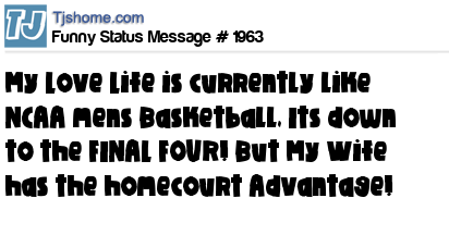 X says My Love Life is currently like NCAA mens Basketball, Its down to the FINAL FOUR! But My Wife has the homecourt Advantage!