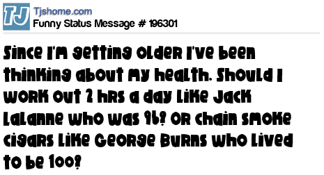 X says Since I'm getting older I've been thinking about my health. Should I work out 2 hrs a day like Jack Lalanne who was 96? Or chain smoke cigars like George Burns who lived to be 100?