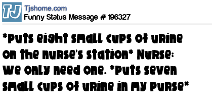 X says *puts eight small cups of urine on the nurse's station* Nurse: We only need one. *puts seven small cups of urine in my purse*