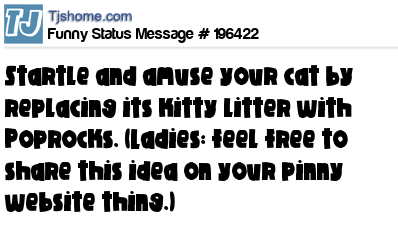 X says Startle and amuse your cat by replacing its kitty litter with Poprocks. (Ladies: feel free to share this idea on your pinny website thing.)