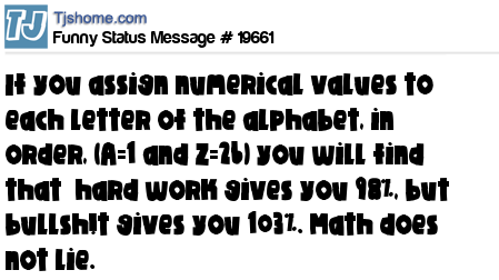 X If you assign numerical values to each letter of the alphabet, in order, (A=1 and Z=26) you will find that hard work gives you 98%, but bullsh!t gives you 103%. Math does not lie.