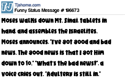 X says Moses walks down Mt. Sinai, tablets in hand, and assembles the Israelites. Moses announces, "I've got good and bad news. The good news is that I got Him down to 10." "What's the bad news?", a voice cries out. "Adultery is still in."