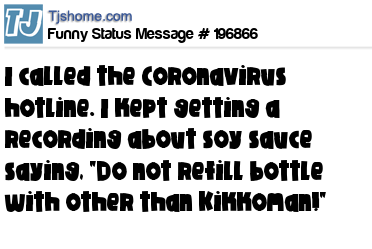 X says I called the Coronavirus hotline. I kept getting a recording about soy sauce saying, "Do not refill bottle with other than Kikkoman!"