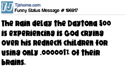 X says The rain delay the Daytona 500 is experiencing is God crying over his redneck children for using only .000001% of their brains.