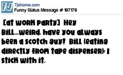 X says [at work party] Hey Bill...weird, have you always been a scotch guy? Bill (eating directly from tape dispenser): I stick with it.