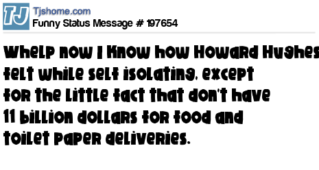 - # 198100 Think I'm starting to understand how Howard Hughes must have felt self isolating, except for I'm not staying in a luxury Las Vegas hotel, have billions of dollars or servants leaving things at my door, but other than that I think I understand how he felt.