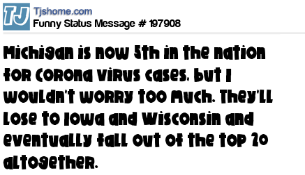 X is Michigan is now 5th in the nation for Corona virus cases, but I wouldn't worry too much. They'll lose to Iowa and Wisconsin and eventually fall out of the top 20 altogether.