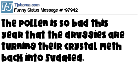 - # 185716 The pollen is so bad this year that the folks in the trailer parks are cooking their crystal meth back into Sudafed.