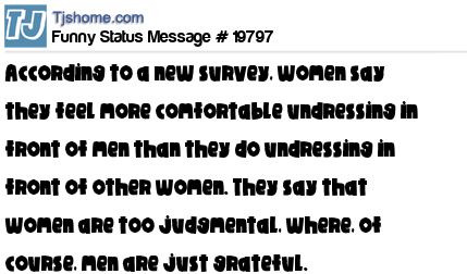 - # 16567 According to a new survey, women say they feel more comfortable undressing in front of men than they do undressing in front of other women. They say that women are too judgmental, where, of course, men are just grateful.