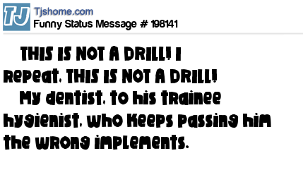 X says THIS IS NOT A DRILL! I repeat, THIS IS NOT A DRILL! – My dentist, to his trainee hygienist, who keeps passing him the wrong implements.