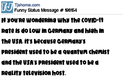 X is If you're wondering why the COVID-19 rate is do low in Germany and high in the USA, it's because Germany's president used to be a quantum chemist and the USA's president used to be a reality television host.