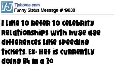 X I like to refer to celebrity relationships with huge age differences like speeding tickets, Ex: Hef is currently doing 84 in a 20