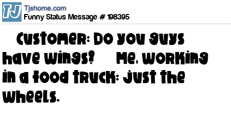 X says     Customer: Do you guys have wings?      Me, working in a food truck: just the wheels.