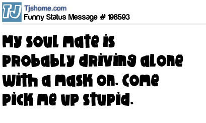 X is My soul mate is probably driving alone with a mask on. Come pick me up stupid.