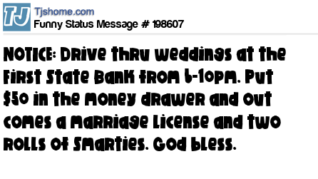 X says NOTICE: Drive thru weddings at the First State Bank from 6-10pm. Put $50 in the money drawer and out comes a marriage license and two rolls of Smarties. God bless.