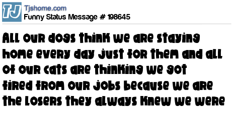 X says All our dogs think we are staying home every day just for them and all of our cats are thinking we got fired from our jobs because we are the losers they always knew we were