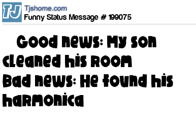 X says Good news: My son cleaned his room Bad news: He found his harmonica