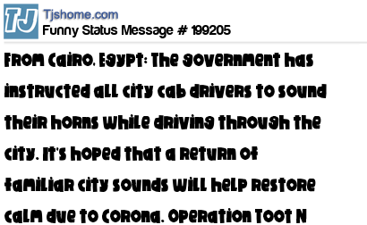 - # 199203 From Cairo, Egypt: The government has instructed all city cab drivers to sound their horns while driving through the city. It's hoped that a return of familiar city sounds will help restore calm due to the pandemic. Operation Toot N Calm Em will last abou