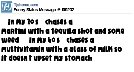 X says In my 20’s – chases a martini with a tequila shot and some weed In my 40’s – chases a multivitamin with a glass of milk so it doesn’t upset my stomach