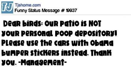X Dear birds: Our patio is NOT your personal poop depository! Please use the cars with Obama bumper stickers instead. Thank you. -Management-