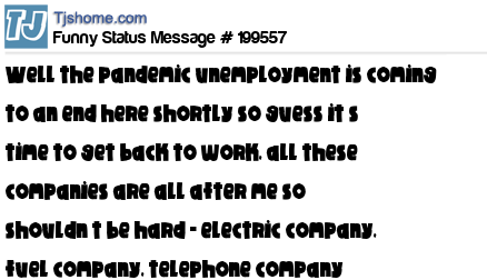X says Well the pandemic unemployment is coming to an end here shortly so guess it’s time to get back to work, all these companies are all after me so shouldn’t be hard - electric company, fuel company, telephone company