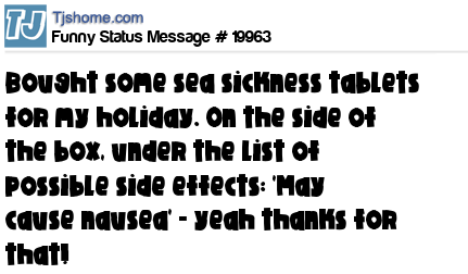 X bought some sea sickness tablets for my holiday. On the side of the box, under the list of possible side effects: 'May cause nausea' - yeah thanks for that!