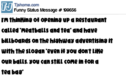 X says I'm thinking of opening up a restaurant called "meatballs and tea" and have billboards on the highway advertising it with the slogan "even if you don't like our balls, you can still come in for a tea bag"