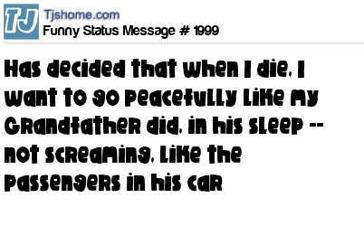 - # 1847 has decided that when I die, I want to go peacefully like my Grandfather did, in his sleep -- not screaming, like the passengers in his car