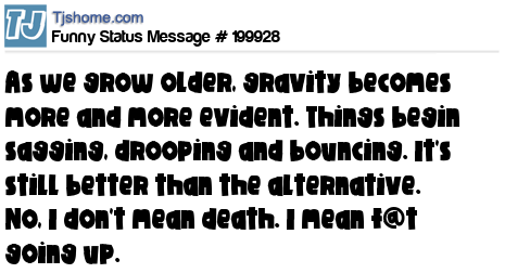 X says As we grow older, gravity becomes more and more evident. Things begin sagging, drooping and bouncing. It's still better than the alternative. No, I don't mean death. I mean f@t going up.