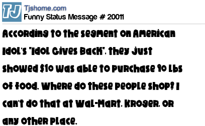 X According to the segment on American Idol's "Idol Gives Back", they just showed $10 was able to purchase 90 lbs of food. Where do these people shop? I can't do that at Wal-Mart, Kroger, or any other place.