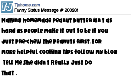X says Making homemade peanut butter isn’t as hard as people make it out to be if you just pre-chew the peanuts first. For more helpful cooking tips follow my blog “Tell Me She didn’t Really Just Do That”.