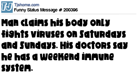 X says Man claims his body only fights viruses on Saturdays and Sundays. His doctors say he has a weekend immune system.