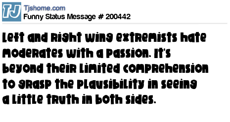 X says Left and right wing extremists hate moderates with a passion. It's beyond their limited comprehension to grasp the plausibility in seeing a little truth in both sides.