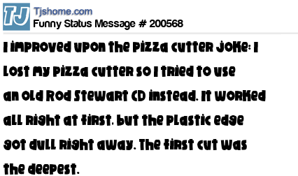 X says I improved upon the pizza cutter joke: I lost my pizza cutter so I tried to use an old Rod Stewart CD instead. It worked all right at first, but the plastic edge got dull right away. The first cut was the deepest.