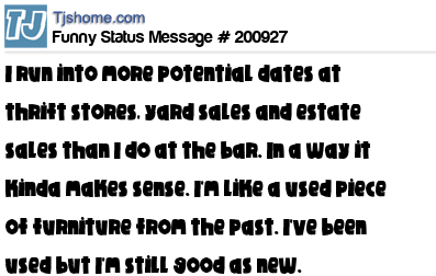 X is I run into more potential dates at thrift stores, yard sales and estate sales than I do at the bar. In a way it kinda makes sense. I'm like a used piece of furniture from the past. I've been used but I'm still good as new.