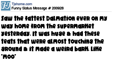 X says Saw the fattest Dalmation ever on my way home from the supermarket yesterday. It was huge & had these teats that were almost touching the ground & it made a weird bark, like "moo"