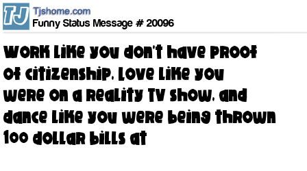 X Work like you don't have proof of citizenship, Love like you were on a reality TV show, and dance like you were being thrown 100 dollar bills at