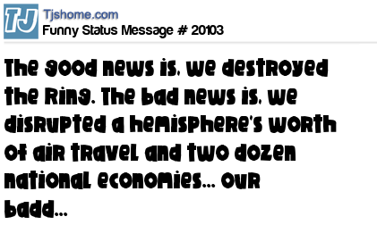 X The good news is, we destroyed the Ring. The bad news is, we disrupted a hemisphere's worth of air travel and two dozen national economies... our badd...