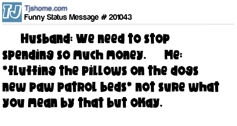 X says Husband: We need to stop spending so much money. Me: *fluffing the pillows on the dogs’ new paw patrol beds* not sure what you mean by that but okay.